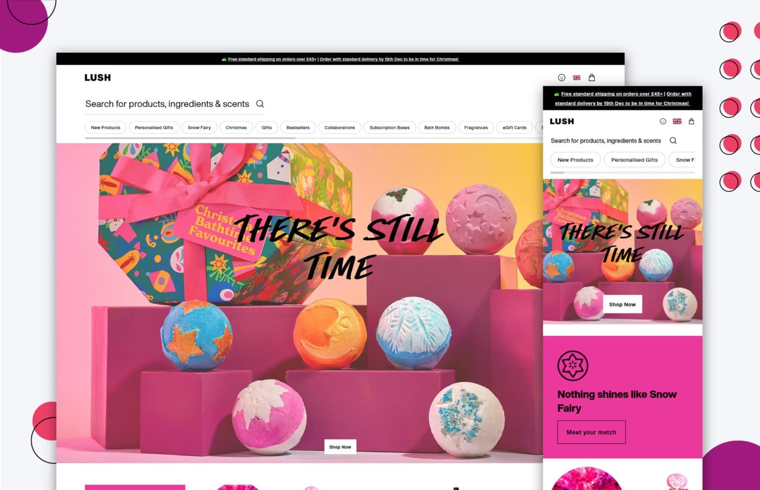 Le site Web cosmétique de Lush s’engage immédiatement en raison des couleurs vives utilisées tout au long de la conception. La navigation est également intéressante et facile à utiliser, avec un curseur vous permettant de parcourir rapidement la conception de leur page de catégorie.